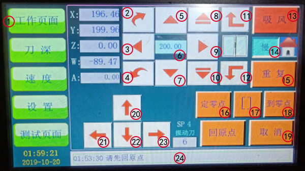 11. 沖刀右轉 12. 沖刀向左轉動 13. 吸風開關 14. 快/慢切換 15. 開始切割 16. 定工作點位 17. 尋找材料邊框 18. 到工作臺點位 19. 取消切割